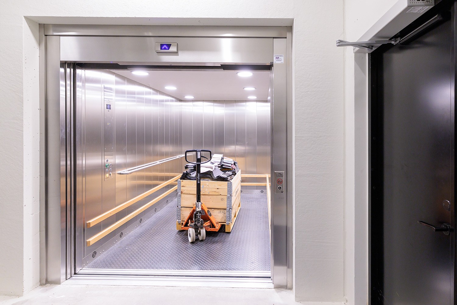 För att underlätta hanteringen av gods och utrustning installerades även en robust ALT Maxima lasthiss med en kapacitet på 3250 kg, också över tre plan. Personhissen är maskinrumslös med integrerat apparatskåp på det översta planet medan lasthissen har maskinrum på markplan.