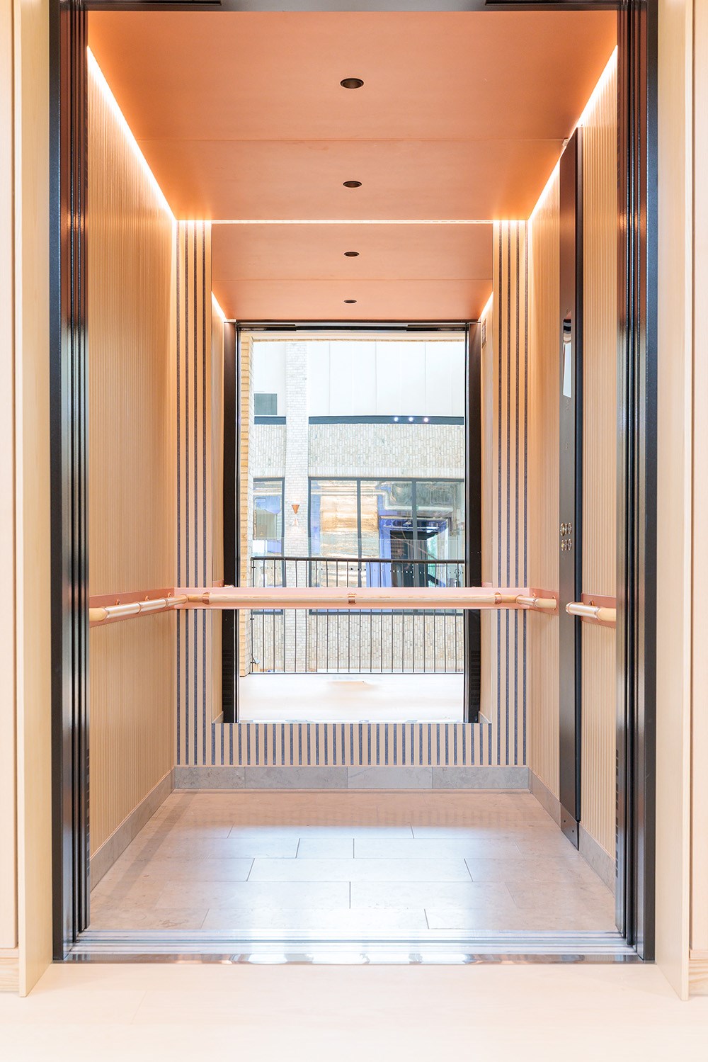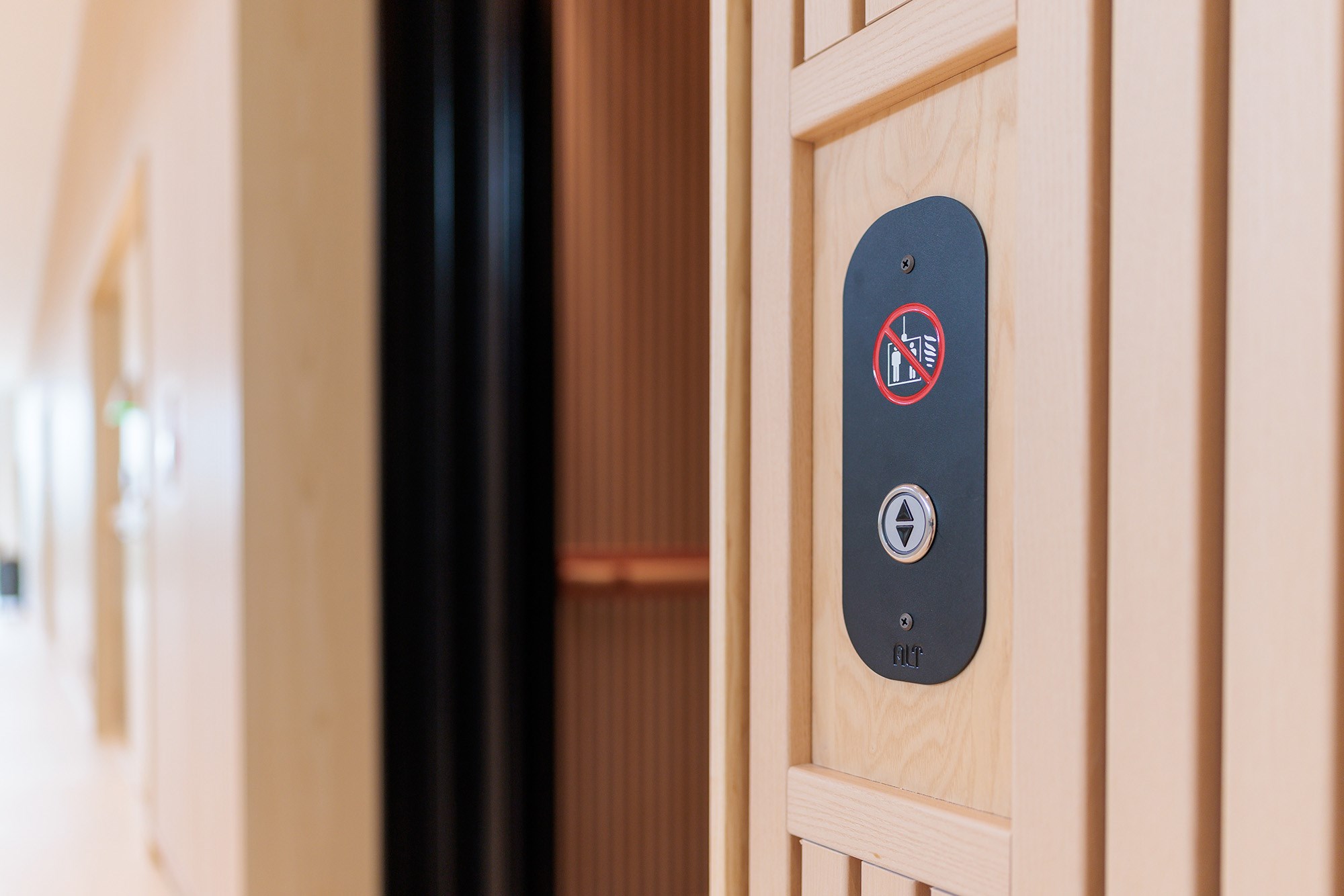 Hissen är en specialanpassad ALT Trend 600 med extra hög hisskorg och men en inredning som följer övriga byggnadens materialval. (Se detaljbilder i slutet av artikeln.)